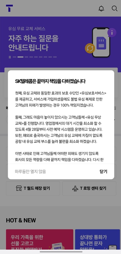 이번 사고와 관련하여 고객님들의 우려를 해소시켜 드릴 수 있는 유심보호서비스(무료)를 순차적으로 안내드리고 있습니다.